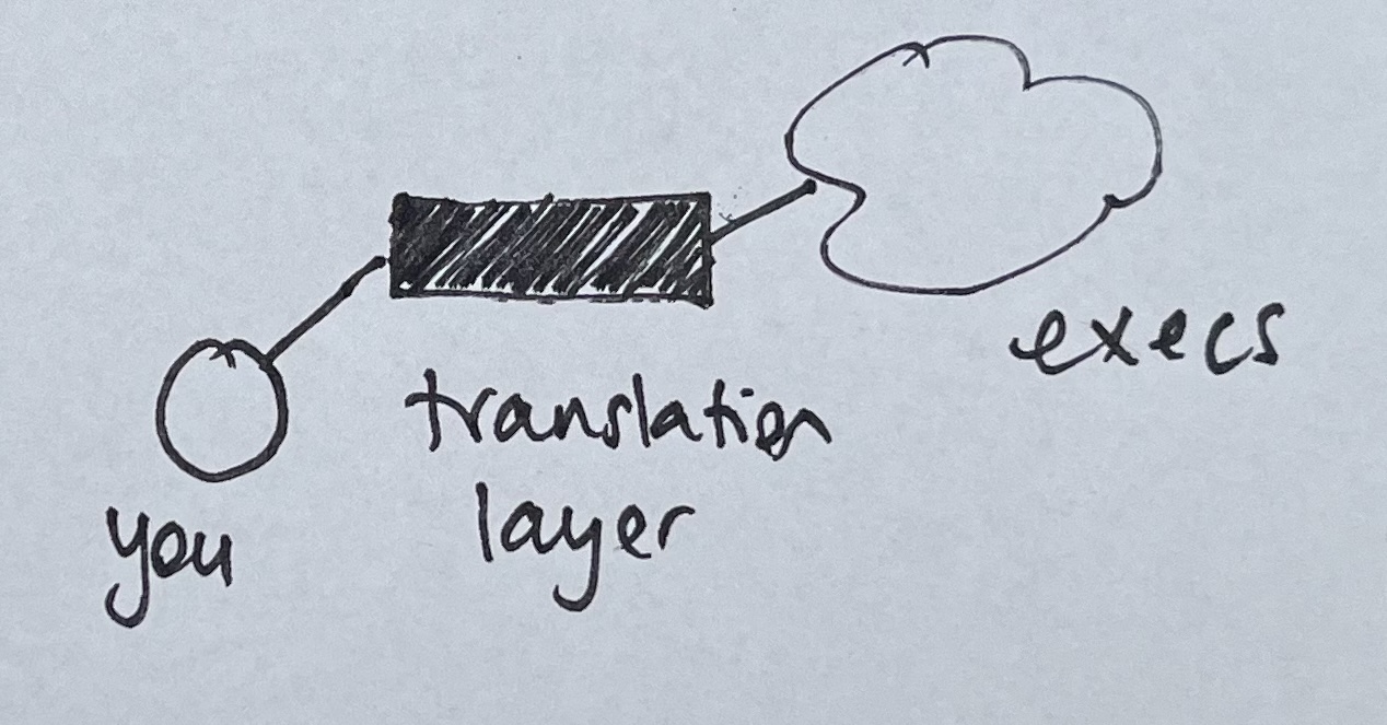 If you don’t translate, they will have to do a lot of extra work to understand what you are asking for. Even when your CEO or the exec you are talking to was formerly an engineer, don’t forget they have a huge amount of other context and not much bandwidth for your request, so even if they have the experience to understand it, it might not be available in that moment. And most execs won’t have that background.